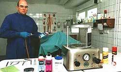 Die große OP-Lampe taucht den gekachelten Raum in unwirkliches Weiss. Klemmen, Scheren und Pinzetten liegen bereit. An der Wand hängen zwei Abbildungen, die jeder Arterie und Vene im menschlichen Körper ihren lateinischen Namen zuordnen. Zwei Männer sind in dem steril wirkenden Raum. Der eine liegt regungslos auf einem metallenen Tisch in der Mitte. Der andere trägt einen blauen Operationskittel. Gerade hat er seine Schutzbrille aufgesetzt. Frank Odendahl ist so weit. Er beugt sich zur Hals-Vene des Mannes. Die Behandlung beginnt. Betäubt worden ist der Patient nicht. Und wird dennoch von der mehrstündigen Prozedur nichts mitbekommen. Er ist seit 36 Stunden tot.